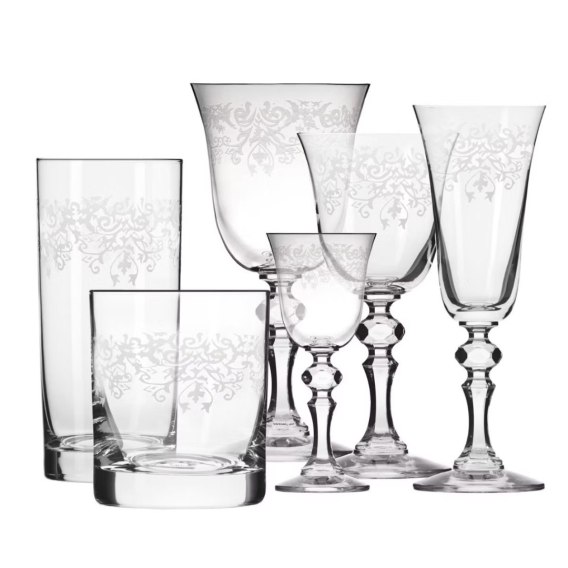 Wytworny, bogato zdobiony komplet kieliszków i szklanek z linii Krista Deco to elegancka ozdoba stołu, otwartego barku i witryny. Kieliszki i szklanki wchodzące w skład kompletu mają eleganckie kształty i popularne pojemności, co czyni z nich nie tylko idealny prezent ślubny, na nowe mieszkanie czy inną, specjalną okazję. Wszystkie elementy zestawu ozdobiono delikatnym, bezbarwnym ornamentem. Cechą charakterystyczną kieliszków jest także wysoka nóżka do trzymania ozdobiona detalem przywodzącym skojarzenia z diamentem. Idealnie przejrzyste szkło Crystalline pięknie rozprasza światło, ponadto jest bardziej trwałe na matowienie czy uszkodzenia mechaniczne.